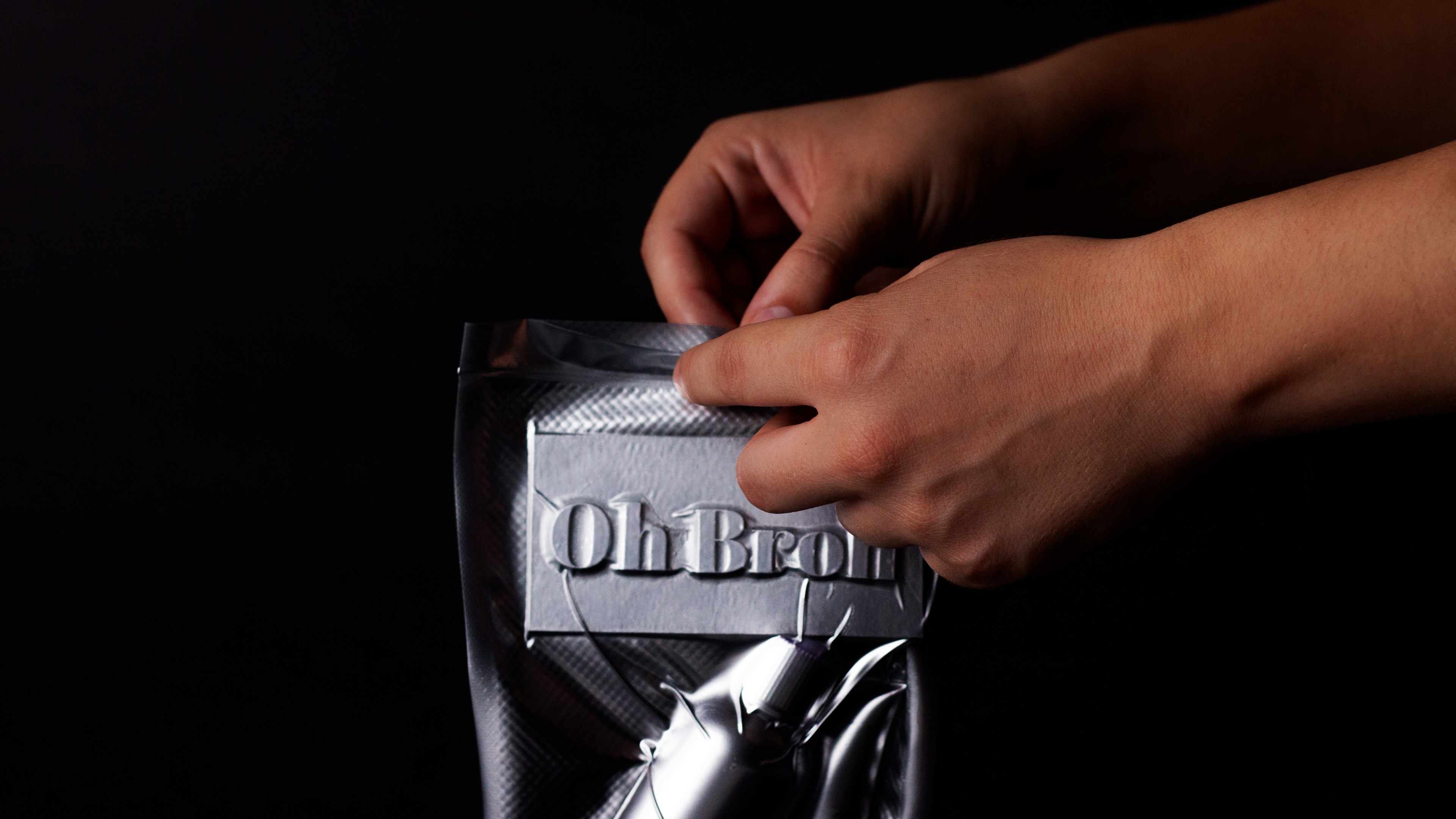 Un pack che non nasconde niente, anzi riflette: la confezione di Oh Broh è realizzata in materiale specchiante e custodisce un mini-specchio estraibile.
